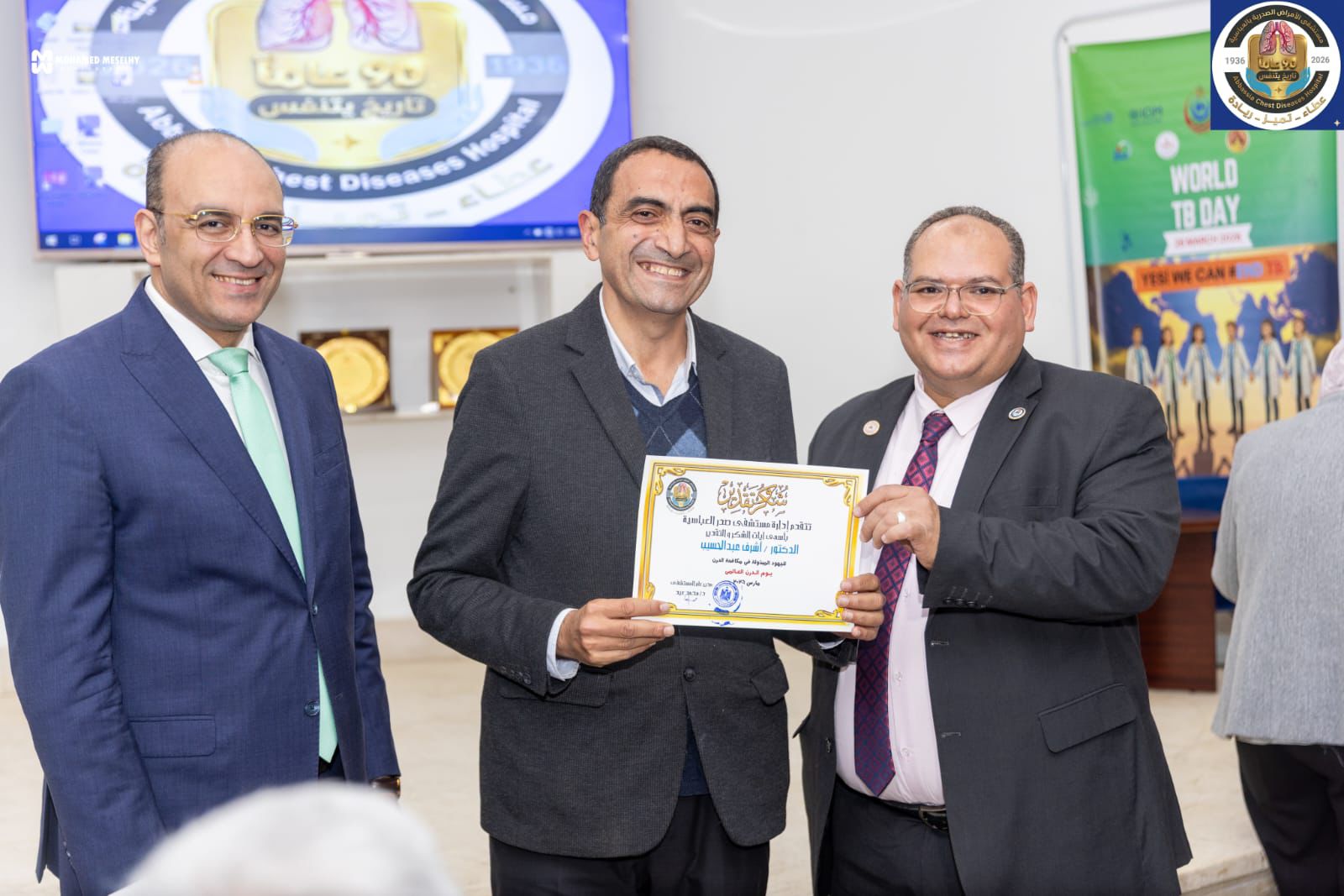 جاءت الفعالية بحضور وتشريف الأستاذ الدكتور/ محمد عوض تاج الدين – مستشار فخامة رئيس الجمهورية لشؤون الصحة والوقاية، الأستاذ الدكتور/ تامر مدكور – رئيس قطاع الشؤون الصحية بالقاهرة، الدكتور/ وجدي أمين – مدير الإدارة العامة للأمراض الصدرية بوزارة الصحة، الدكتورة/ إيمان هارون – وكيل المديرية للطب الوقائي، الدكتور/ محمد عيد – وكيل المديرية للطب العلاجي، الدكتور/ أحمد جمال – مدير إدارة الأمراض الصدرية بالمديرية، والدكتور/ محمد عيد – مدير المستشفى.